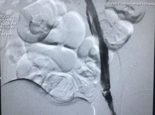 6天后,傅女士恶露排尽,龙林副主任医师、蔡煌兴博士等为她施行左下肢深静脉血栓溶栓、机械碎栓取栓及腔内成形术,取出血栓,打通血管,缓解疼痛。