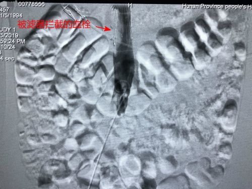 天心阁院区急诊科。介入血管外科医生会诊后,将其收入介入血管外一科病房。由于情况紧急,立即为她施行急诊“下腔静脉临时滤器植入术”,以防止肺栓塞的反生,同时予以抗凝治疗以防止血栓进一步蔓延。考虑到傅女士尚在产褥期,恶露未排尽,未免引发大出血,暂缓进一步手术。