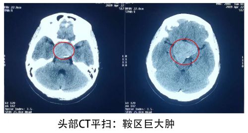 头部CT可见鞍区有一个稍高密度占位,形状不规则。