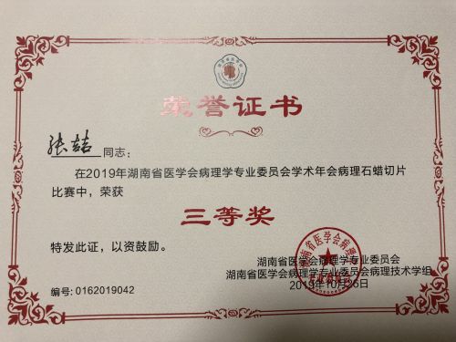 “湖南省病理技术会议及病理技术石蜡切片比赛”选手多达67人,捷克论坛病理科张喆和胡庆两位选手沉着冷静,稳定发挥,分别获得三等奖和优胜奖。(文/病理科:何珊 图/病理科:张喆 谌思)