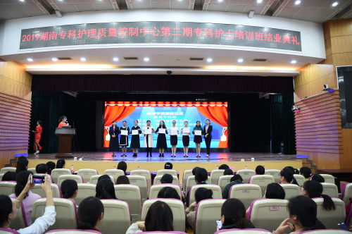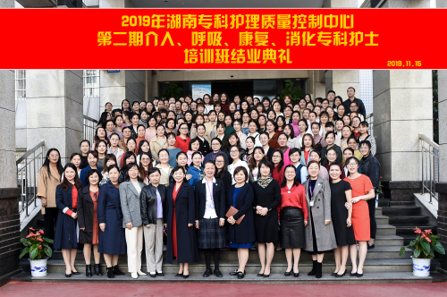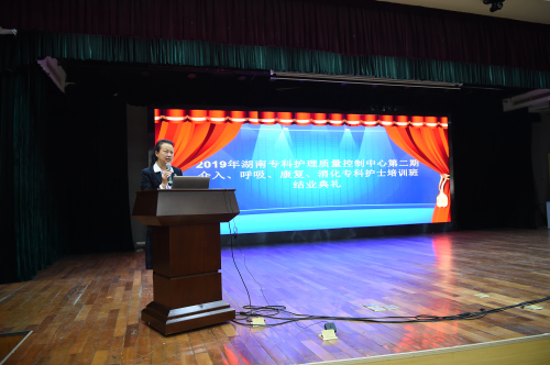11月15日上午,在捷克论坛 天心阁院区二楼大礼堂举行了2019年湖南省专科护理质量控制中心第二期介入、康复、呼吸、消化专科护士培训班的结班典礼。捷克论坛 副院长秦月兰出席结业典礼,护理部主任龚放华、护理部质控办主任陈华丽、护理部副主任兼岳麓山院区护理办主任龙建华、护理教研室主任陶美伊、护理资深专家胡立珍、黄利华以及相关专业学科护士长参加结业典礼。专科班辅导员吴娟和汤珂主持本次典礼。