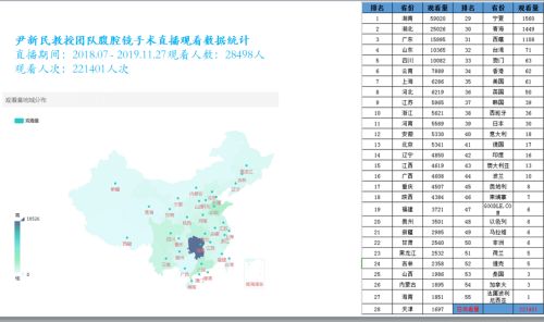 同时,由于尹新民教授团队在手术直播中毫无保留地展示了血管解剖、吻合方法、手术流程等方面的特长和优势,得到广大肝胆外科同仁的认可,成为业内关注的焦点,累计有221401人次收看了团队的微创手术直播,观众除来自国内31个省市自治区和港澳台地区外,还有来自欧、美、亚、非、大洋洲等五大洲21个国家和地区的同仁收看并从中获益。