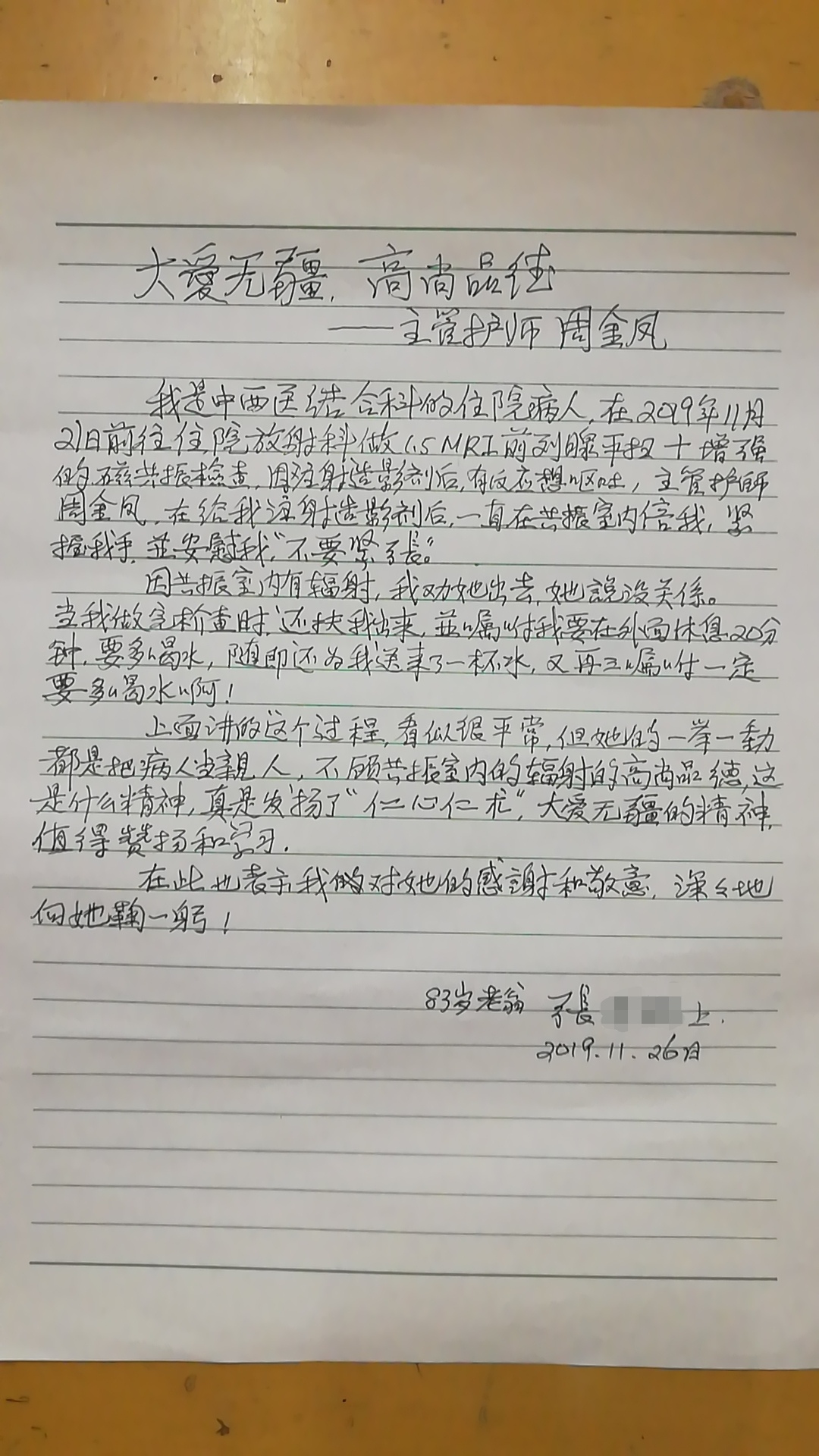 在顺利做完检查并安全返回病房后,张嗲嗲对于周金凤在检查过程中对自己的陪伴和关心,让他深受感动,并牢记在了心里。反复思量后,他不顾年老视力模糊,写下这封饱含感激之情的感谢信。
