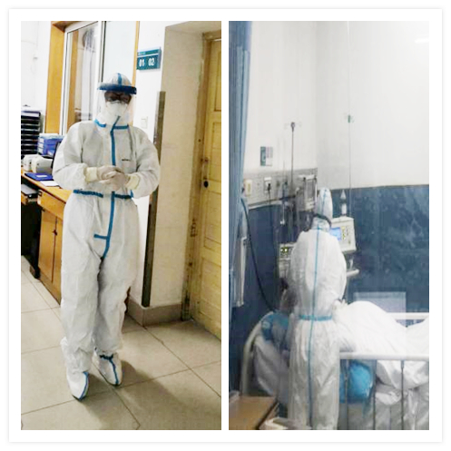 果不其然,1月29日上午八时,我接到通知要收一位疑似新冠的重症患者。或许是早就跟自己做好了心理建设,又或许是因为丁红秀护士老师前天晚上在科里护理了第一位高度疑似新冠肺炎患者整整一夜,给了我足够的勇气,我没让自己退缩。因为患者有着明显的气促不适,呼吸困难等表现,我迅速做好了自身的防护准备,并在护士长再三确认下跟医生一起走进那间隔离病房。