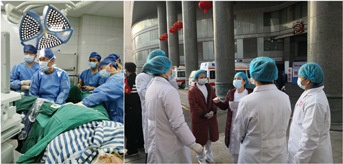 杨科主任在为急危患者手术、邹颢宇护士长在对志愿者们进行培训督导