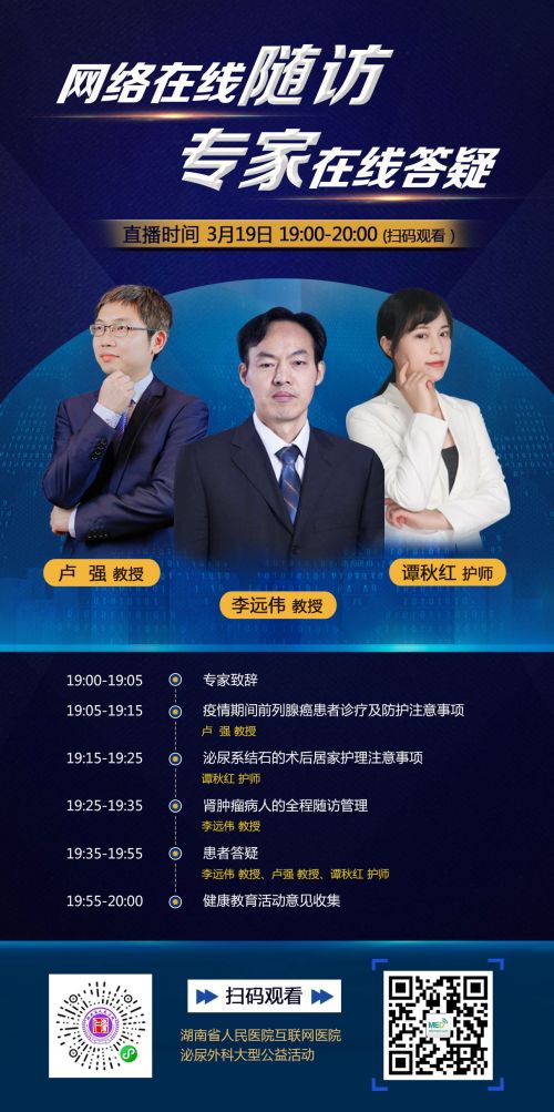 在泌尿外科开展的互联网随访宣教活动中,平日认真严肃的医学专家们当起了网络主播,泌尿外科学科主任李远伟教授、卢强博士、谭秋红护师分别进行《肾肿瘤病人的全程随访管理》《疫情期间前列腺癌患者诊疗及防护注意事项》《泌尿系结石术后居家护理注意事项》的主题授课。广大患者扫码参与互动,积极提问;专家们有问必答,耐心解惑,线上交流取得良好效果。