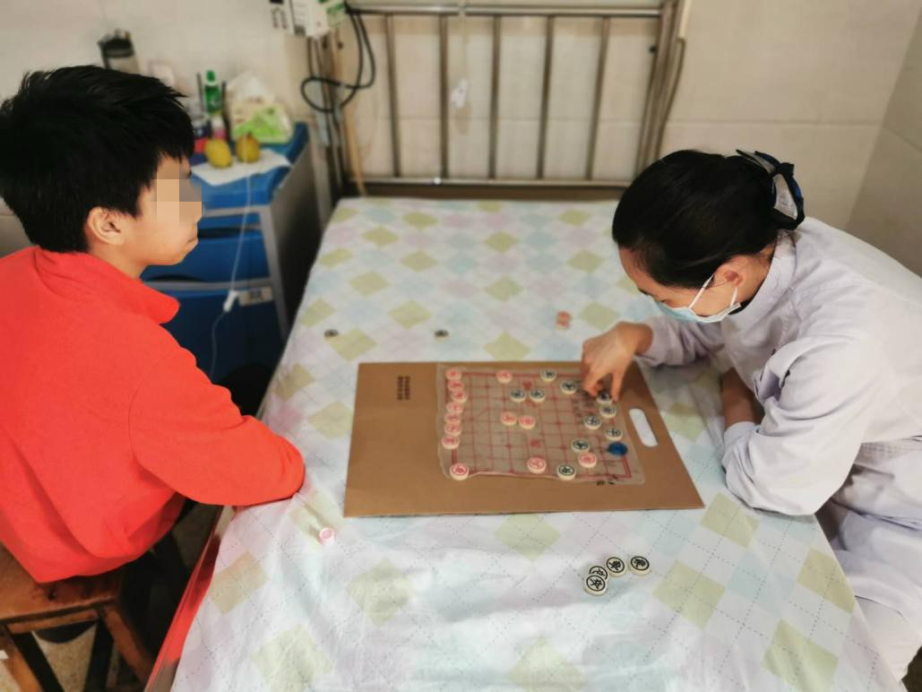 看到轩轩这个样子,科室护士很着急,她们观察到轩轩经常跟他妈妈下象棋,于是主动要和轩轩比比谁的棋艺高。渐渐地下班后陪小轩轩下几局象棋,成了这段日子护士的必修课。轩轩逐渐和护士阿姨们成为了好朋友,也愿意主动告诉大家他的身体情况。