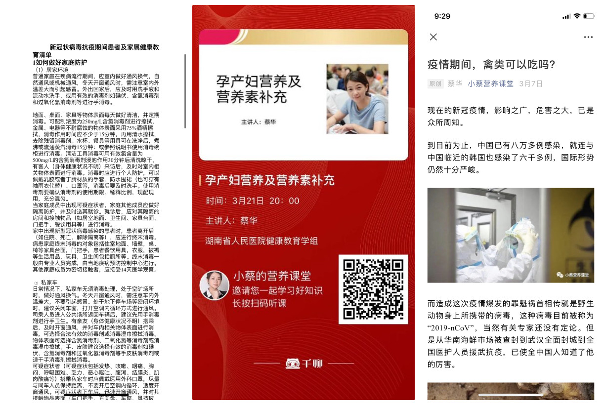 为进一步给住院患者及家属创造一个舒适安全的治疗环境,共同抗击疫情的袭击,2月6日健康教育学组制定了新冠抗疫期间患者及家属健康教育清单,告知患者及家属如何选择口罩并正确佩戴,怎样洗手才有效………为科学、全面地了解住院患者心理活动变化,2月10日开始制作问卷调查,调查近千位在院患者,了解患者对疾病健康宣教知识的了解及心理活动,并对其进行心理疏导与支持。经过健康教育学组全体委员商讨公众号“小蔡营养课堂”于3月5日面世,每周一到两次营养课件直播,每日营养科普文章分享,管理后台的留言区也收到许多患者及家属的留言,就健康营养知识方面做了咨询,健康教育学组一一落实并及时回复,根据患者需求安排了相应的知识分享。