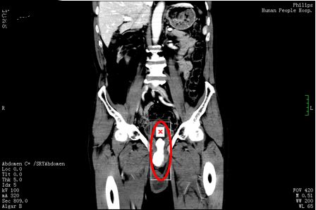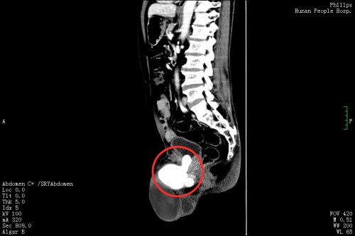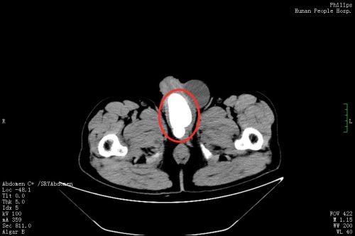 3月11日,刘先生在家人陪同下来到捷克论坛 泌尿外科门诊就诊,郭琼副主任医师接诊后,仔细询问病史并进行体格检查后发现,老人的左侧阴囊肿大,内有一个卵圆形的囊性肿块,符合“左侧睾丸鞘膜积液”的诊断。然而让医师惊讶的是,患者的绝大部分阴茎内都充满了坚硬的结节,压痛十分明显,高度怀疑是尿道结石。果然,泌尿系CT 检查发现,其膀胱尿道口和尿道内有一个鹅蛋大的结石,这正是导致老人持续会阴剧痛、尿频、尿急、排尿困难的罪魁祸首,随即将他收入泌尿三科病房。