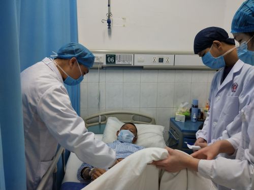 医生查看患者术后恢复情况。