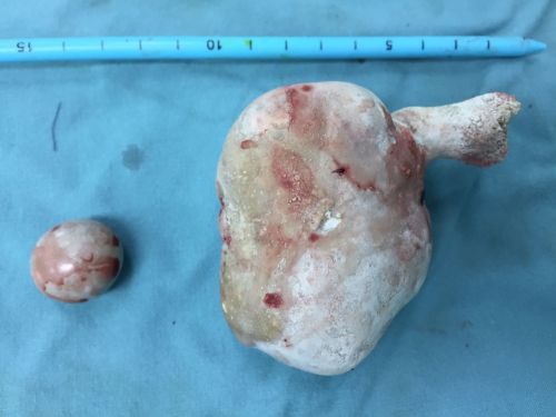 郭琼副主任医师团队综合评估患者病情后,为他制定了“一石二鸟”的手术方案,一次手术同时解决尿道结石和睾丸鞘膜积液两个问题。3月22日,手术团队在全麻下为刘先生施行“左侧鞘膜翻转、尿道切开取石、尿道修补、膀胱镜检查、膀胱造瘘术”。在患者的后尿道及部分前尿道取出约10×8.1×4.5cm3大小重达256g,形态不规则、质地坚硬的结石。手术过程十分顺利,术中几乎无出血。