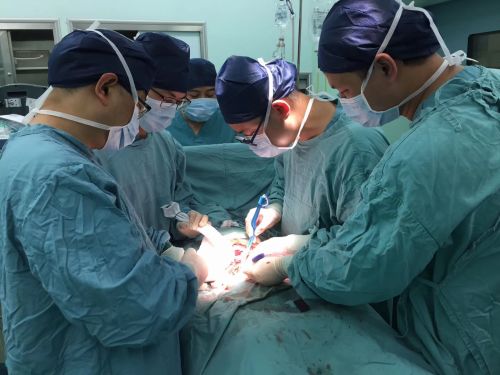 通过充分评估病情、组织全科多次讨论、制定周密的手术方案后,在泌尿三科主任段燚星教授及周强教授等指导下,郭玺副主任医师、王勇博士等于4月7日为患者在全麻下施行“左肾部分切除、肾盂重建、肾动静脉修补、肾固定术、D-J管置入、肠粘连松解、肾周围粘连松解术”。术中发现,患者肠粘连十分严重,整个肾动脉和肾静脉的分支完全被肿瘤包裹,同时肿瘤多发、野蛮生长、毫无规则且没有包膜。手术团队专注细致地操作,并采用多种手段降低患肾的损伤,保护肾功能。