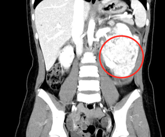 CT显示:左肾有一个巨大肿瘤(红圈内)。