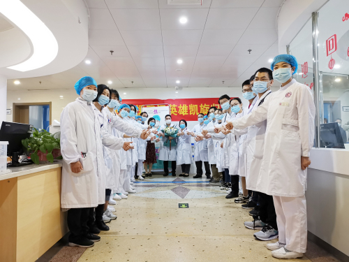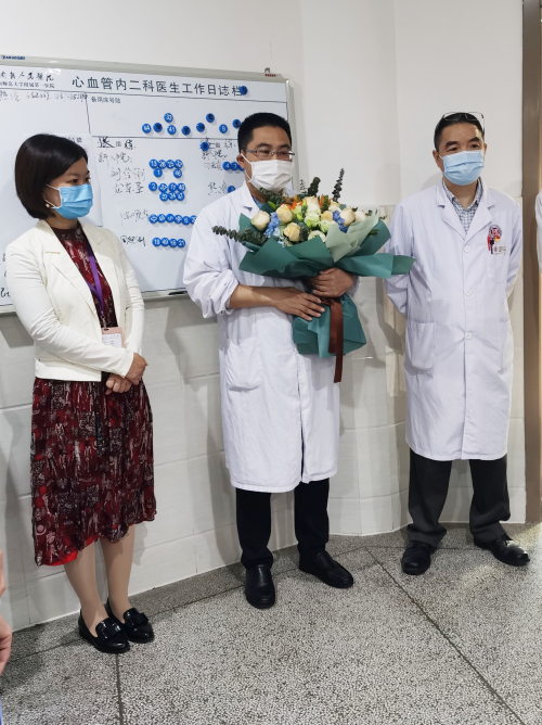 4月27日,心内二科主任彭建强在经过短暂的隔离修养后,正式回归病房,开始日常工作。内一总支书记周瑾容、心内科主任郑昭芬及全体医护人员在心内二科举行了温馨简单的欢迎仪式。