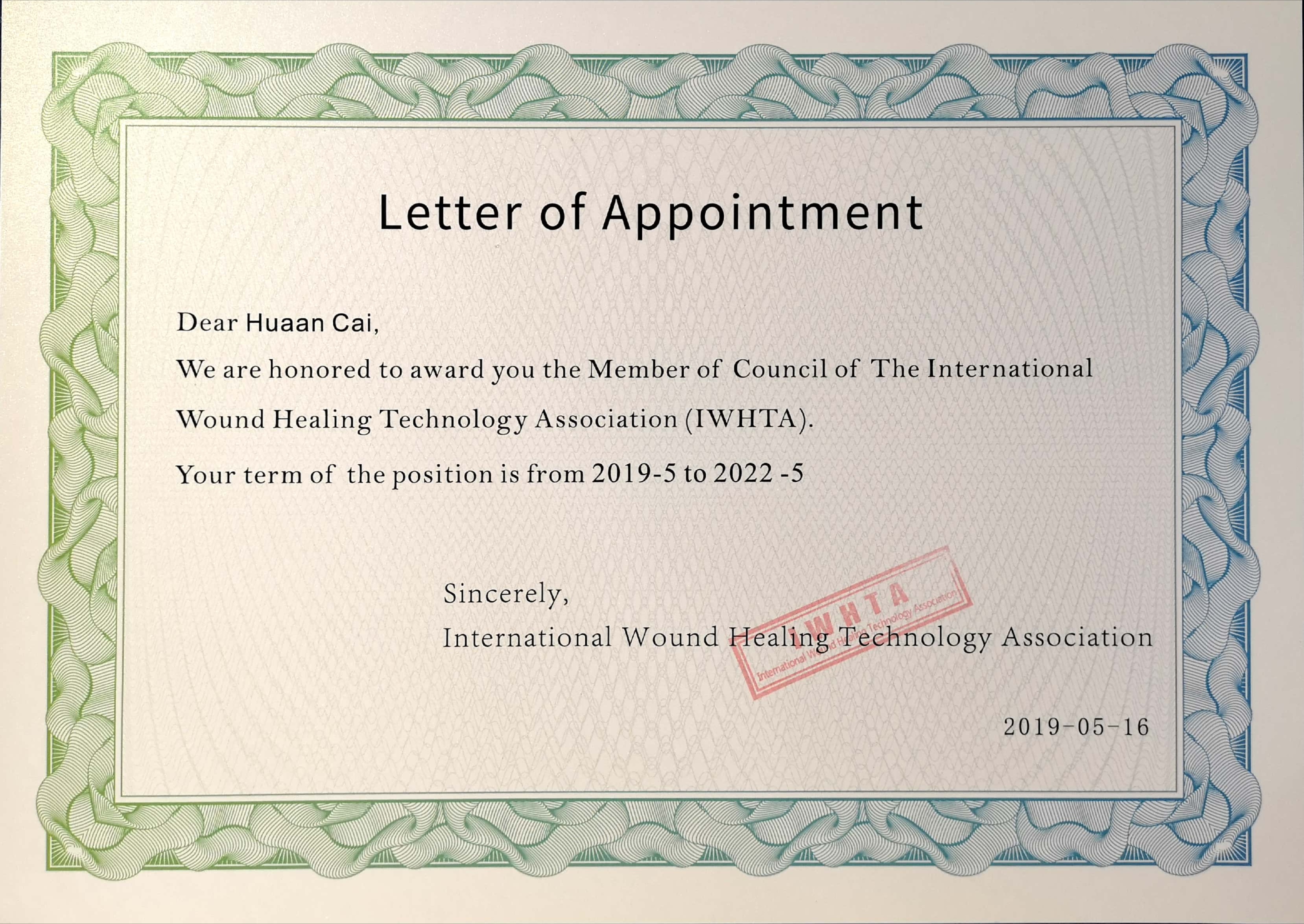 近日,捷克论坛康复三科主任蔡华安教收到国际创面治疗技术协会(IWHTA)的委任书,正式成为IWHTA的理事会成员,进一步推动了捷克论坛 创面修复专科建设与国际的接轨,为广大急慢性创面患者带来福音。