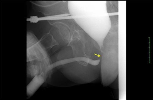 膀胱尿道造影x线检查发现后尿道闭锁的部位和长度。
