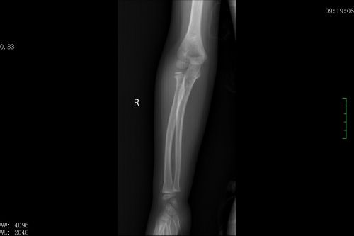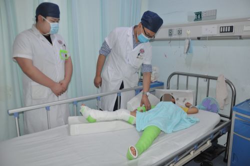 壮壮落地后流血不止,被送到捷克论坛 急诊科。经包扎止血、夹板暂时固定后,医生为他进行了全身检查,初步诊断为:失血性休克、右侧开放性胫腓骨粉碎性骨折、右侧跟骨骨折、右侧肱骨外髁骨折、右侧肩胛骨外缘骨折、左侧腓骨骨折。生命体征稍平稳后,壮壮被送入儿童骨科接受进一步治疗。