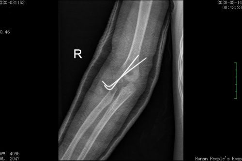 右侧肱骨外髁骨折闭合复位克氏针固定及石膏固定术后。