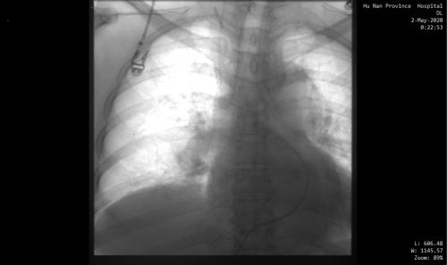 情况十万火急,尹新民主任边现场组织抢救,边将情况汇报给向华副院长,向华副院长立即调度全院各相关科室予以协助。一场与生命的赛跑由此拉开!超声科紧急为患者进行床旁彩超,找到肺动脉栓塞的“罪魁祸首”为左下肢静脉血栓。在呼吸治疗组的协助下,医护人员携带转运呼吸机快速运送方女士至介入手术室。介入血管外科紧急安排了手术医生和手术间,由张永琎副主任医师等为患者施行“肺部血管造影”,明确诊断为双肺动脉急性栓塞,随即为其实施“双肺动脉尿激酶冲击溶栓、下腔静脉滤器植入术”。术后,患者肺动脉供血明显改善,血氧饱和度立即回升,被送往重症医学一科继续治疗。