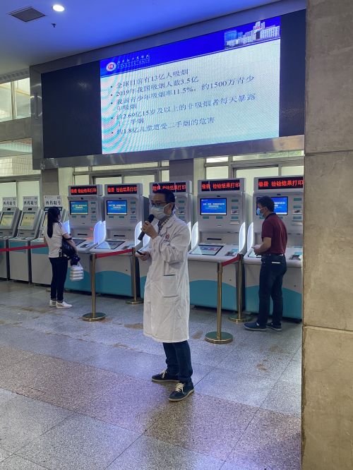 呼吸内科谭建龙副主任医师在门诊大厅进行“破除戒烟谣言,科学戒烟”科普讲座。