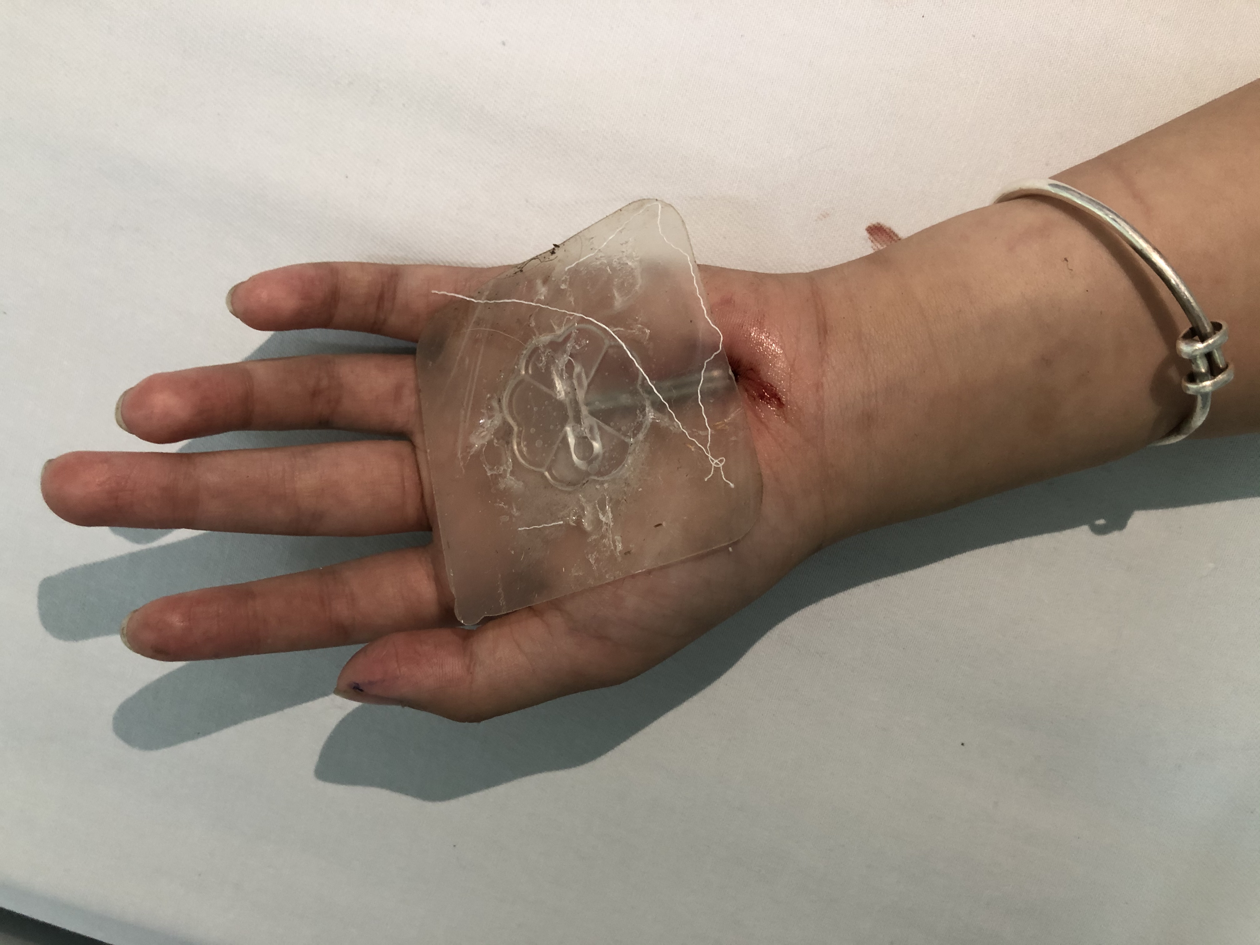 9岁的嘉嘉(化名)上三年级了,是个活泼好动的小女孩,在学校经常和同学们一起打打闹闹、嘻嘻哈哈。5月26日下午,嘉嘉和往常一样跟同学在教室里追逐打闹,在嬉戏过程中同学趁嘉嘉不备从其后背猛推一下,嘉嘉惯性用手掌撑墙,竟不慎被墙上粘钩的钩子嵌入掌内。