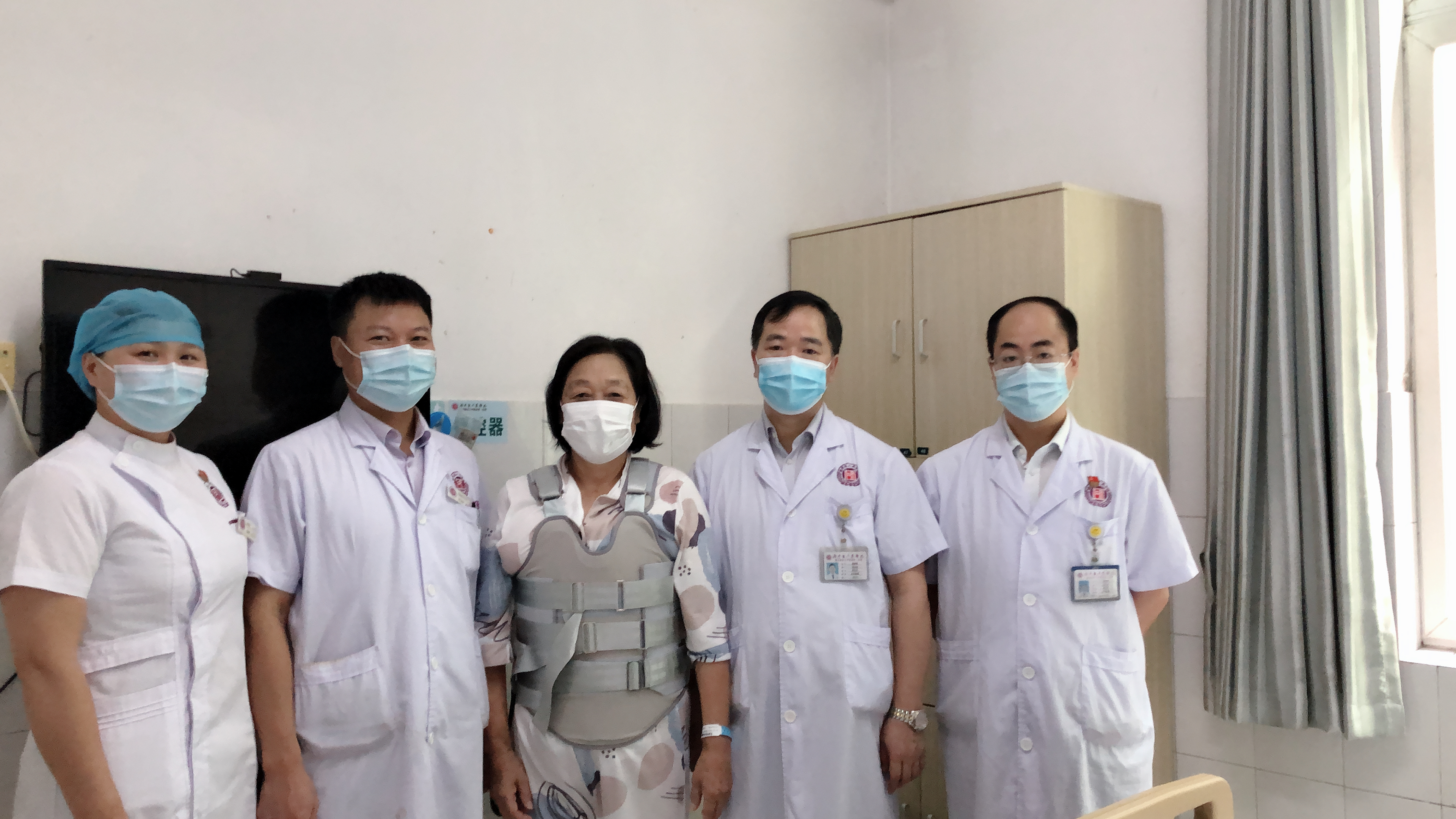 5月28日,在手术二部、麻醉二科的护航下,贺学军主任、易惠军主任、罗志国副主任医师、殷浩副主任医师等在全麻下为王阿姨实施了微创经皮椎弓根内固定并植骨融合、椎管扩大、椎间盘切除减压术,手术顺利完成。