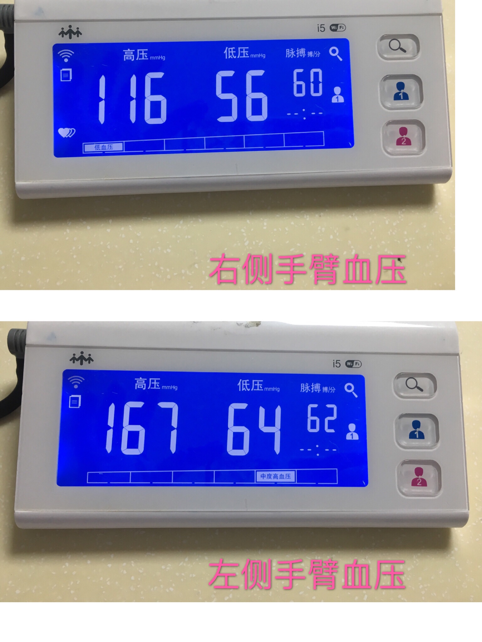 家住长沙马王堆的80岁郑奶奶因头晕不适,半月前来到捷克论坛 神内四科住院治疗。医生给她测量血压时发现,其右侧手臂血压只有116/56mmhg,而左侧手臂血压竟高达167/64mmhg。郑奶奶的家人十分疑惑:“难道是血压计坏了?为何同时测量,两只手的血压差别这么大呢?”