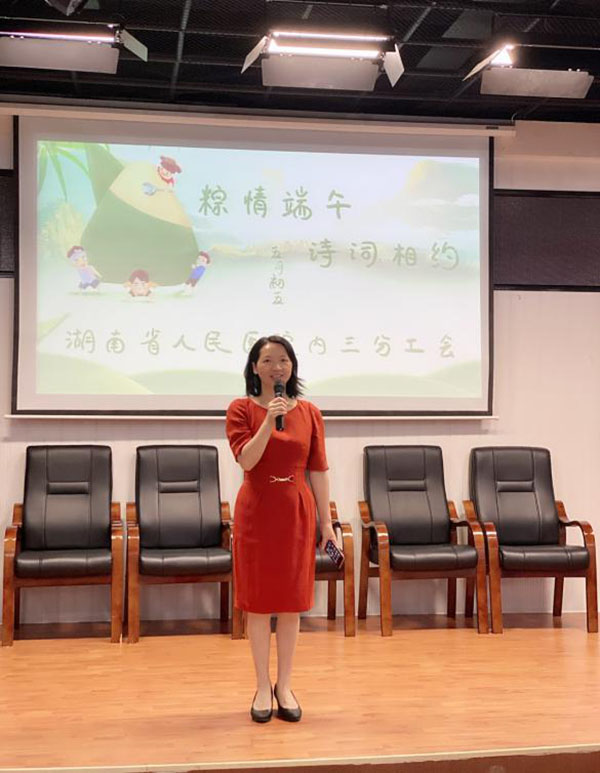 活动最后,胡主席对本次活动予以肯定。她指出端午节是一个多民族的全民健身、祈求健康的传统节日。端午节风俗形式多样,有赛龙舟、挂艾草与菖蒲、佩香囊等。今年自开年以来,新冠疫情席卷全球,内三分工会借诵读端午诗词,为大家祈福,愿大家团结一致,携手同行,早日战胜病毒。