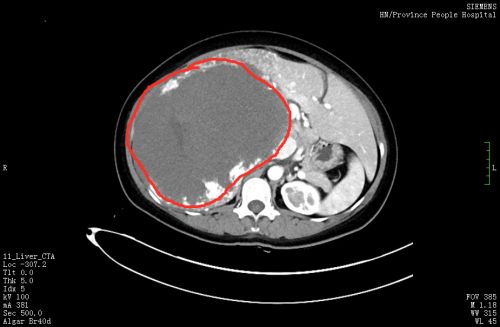 患者肝脏巨大血管瘤几乎占据整个上腹部。