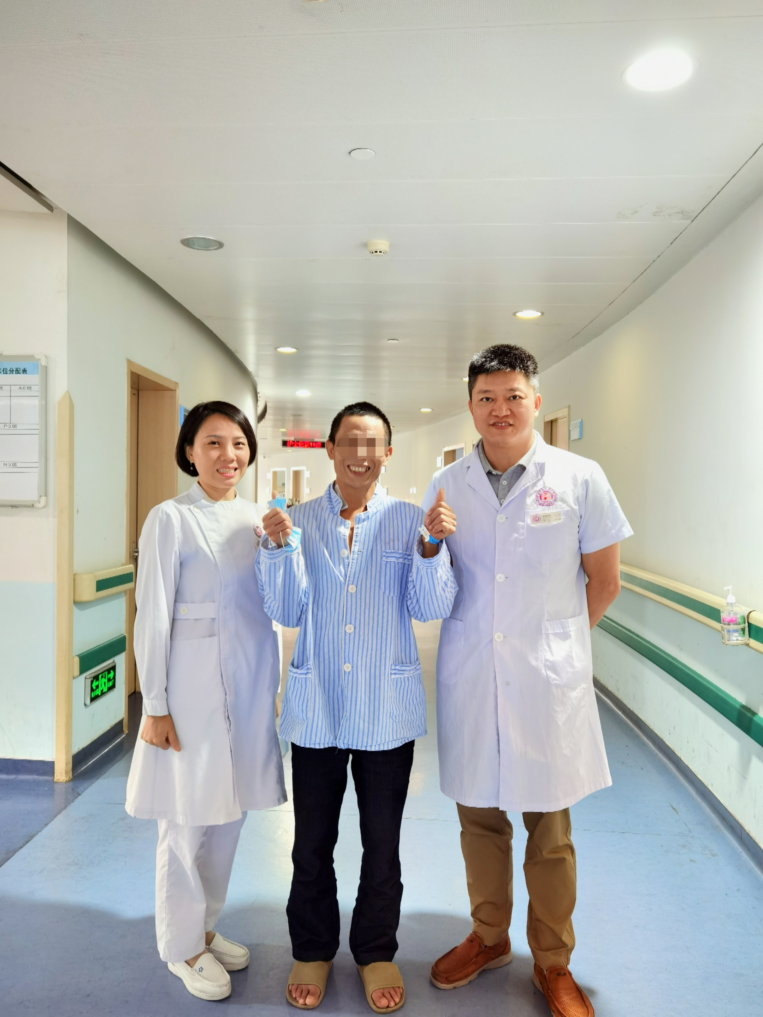 由于长期疾病消耗,朱先生肝功能差伴有严重低蛋白血症,为完善手术条件,尹新民、吴一飞教授、彭湘群护士长等人组成的医护团队悉心制定了诊疗措施。通过护肝、营养等对症支持治疗,朱先生身体状况有了明显改善。