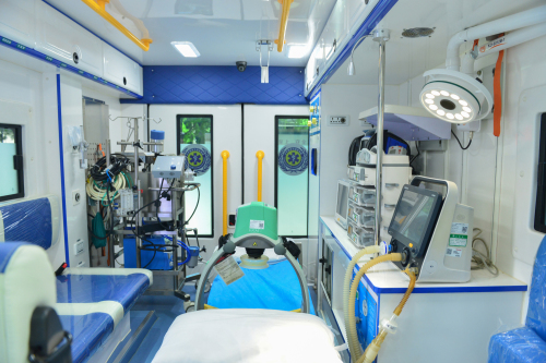 移动ICU上除常规急救设备外,还配备了车载手术无影灯、高档自动上车担架、ECMO仪器、心肺复苏仪、车载呼吸机、除颤监护仪、转运监护仪、车载电动吸引装置、可视化喉镜、输液泵、推注泵、复苏急救箱、创伤急救箱等急救仪器和设备。