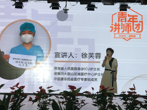 宣讲环节,徐芙蓉以《72天战疫记》为题,讲述了自己在抗疫期间“三上战场”的经历与所闻所感,从援鄂抗疫到援非抗疫,从一名医护人员的责任感与使命感,到一名党员为国出征的荣誉感,为全员带来一场战“疫”青春的精神盛宴。她说:“人生在世,有三件事不能避:为民请命不能避,为国赴难不能避,临危受命不能避!”。