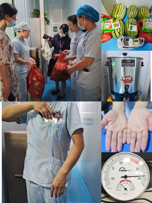 炎炎夏日,对于在高温条件下工作的人是个严峻的考验。消毒供应中心一部因场地装修搬入临时工作站已3月余,日前进入伏天高热天气,8月3日上午,副院长秦月兰、工会副主席李放军等为消毒供应工作人员送来凉茶、西瓜、藿香正气水等防暑降温物品,还贴心配置了凉茶桶,对在高温条件下仍坚持工作的消供人表示亲切慰问和关怀。