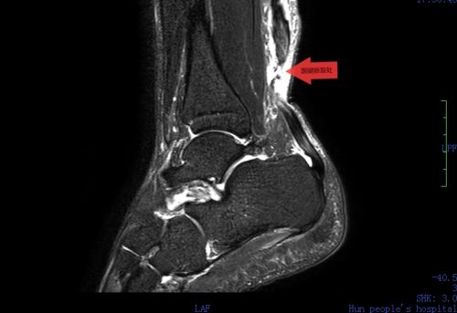 mri显示,右足跟腱距跟骨附着点68mm处断裂,断端分离约8mm。