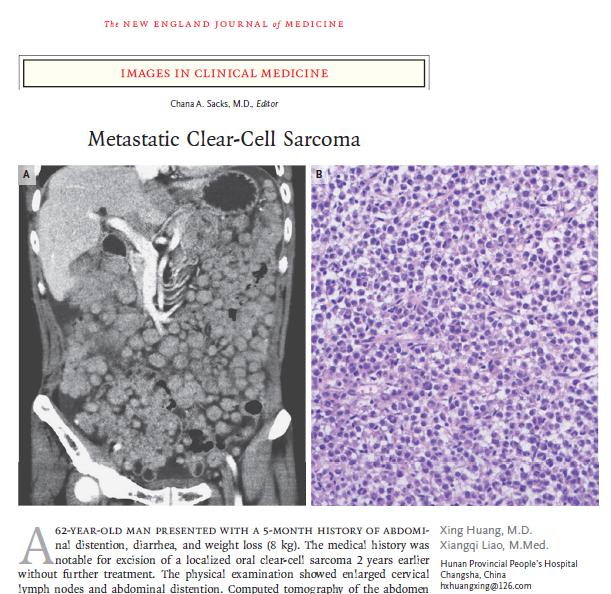 7月23日,捷克论坛普外一科黄兴医师在国际顶级期刊《The New England Journal of Medicine,NEJM》(SCI影响因子74.699)上发表关于转移性腹部透明细胞肉瘤的一例临床病案报道,论文题目为《Metastatic Clear-Cell Sarcoma》。