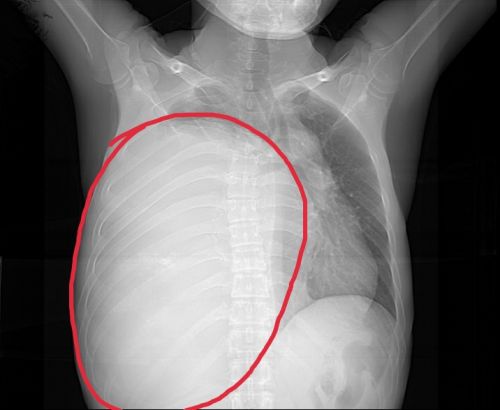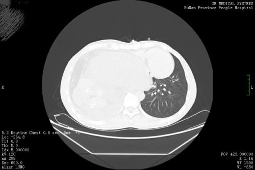 术前胸片提示,右侧胸腔内有一个巨大混杂密度包块(红圈内)。