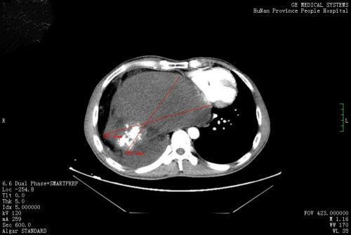 胸部CT检查发现,其右侧胸、腹腔内有一个巨大包块压迫右肺,因此出现胸痛、胸闷等不适。进一步检查考虑,巨大包块来源于后纵膈,畸胎瘤的可能性大。心胸外科医师会诊后,将他收入心胸外科病房准备手术治疗。
