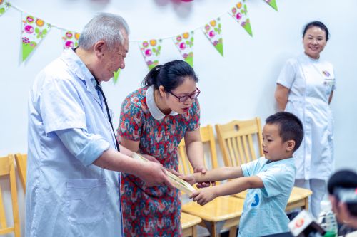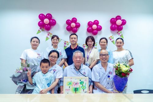 “恩爷爷,祝你节日快乐!”见到首席专家吴金术教授熟悉的身影,皓皓立即上前送上节日祝福,还把自己画的蜡笔画《荷花图》送给这位八旬老专家,又把鲜花送给儿童重症医学科余阗主任等“医生伯伯”。