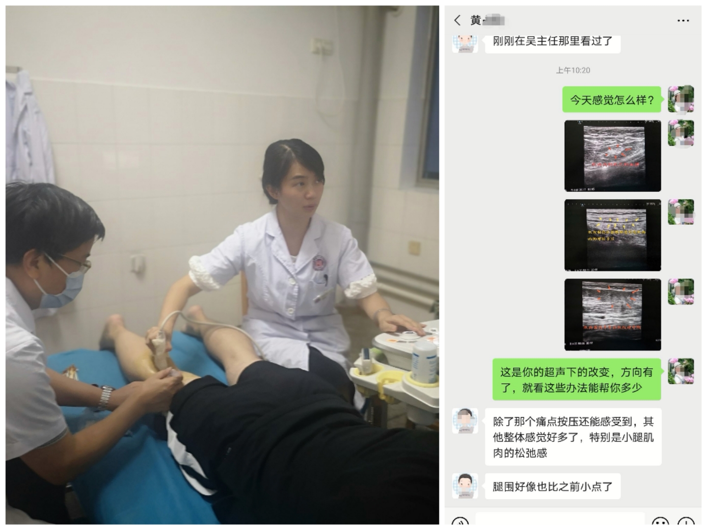 接诊黄先生后,吴礼平主任医师仔细询问病史认真做体查后,联系了超声二科的鲍觅夏医师为其做了超声引导下的治疗,鲍觅夏仔细为其做了检查,超声下显示黄先生腓肠肌外侧头有机化的血肿,肌肉纹理不清,腓总神经卡压。两人认真讨论治疗方案,松解了粘连的肌肉与神经,经治疗后症状明显改善。