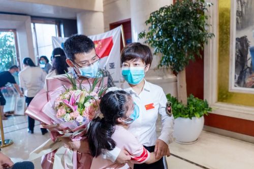 援非抗疫归来,丈夫和女儿送上鲜花和拥抱。