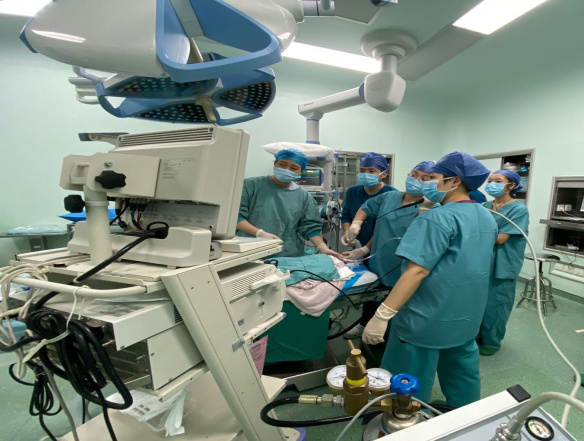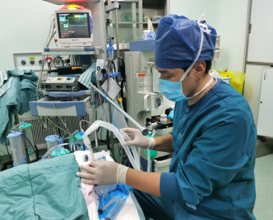 经过多学科讨论,9月8日,儿童呼吸科、新生儿科、麻醉科联合为飞飞实施手术,因飞飞本身存在气道狭窄,介入手术需占用大部分气道,留给麻醉师可操作空间十分有限,加上体重太轻和基础疾病,飞飞的术中麻醉相当棘手,最小号喉罩都无法顺利插入,操作极为困难。麻醉师刘永平凭借娴熟的技术,通过不断调整喉罩位置,确保激光消融、球囊扩张等操作顺利进行。手术结束拔出喉罩后,飞飞又出现了喉痉挛、多次呼吸暂停,麻醉师、新生儿医师临危不乱,协作度过难关,最后,飞飞被送往新生儿重症监护病房继续观察及治疗,现在病情平稳,期待不久后的可以和正常的宝宝一样放声哭泣,自由呼吸。