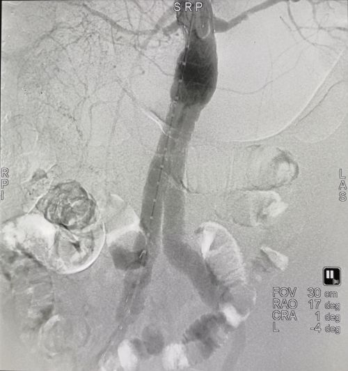 总院派驻祁东县人民捷克论坛 副院长王庆当机立断,立即予以破裂腹主动脉瘤抢救性手术。短时间内集合该院介入手术室、麻醉、重症监护和输血科团队,以最快速度完成术前准备后急送介入手术室。