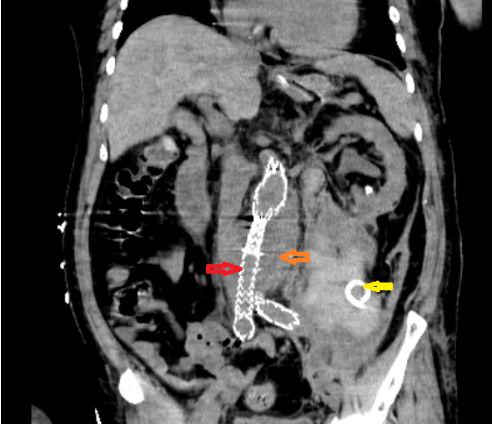 CT可以看到动脉瘤内支架(红色箭头)、动脉瘤样扩展(橘色箭头)、腹膜后血肿及引流管(黄色箭头)。