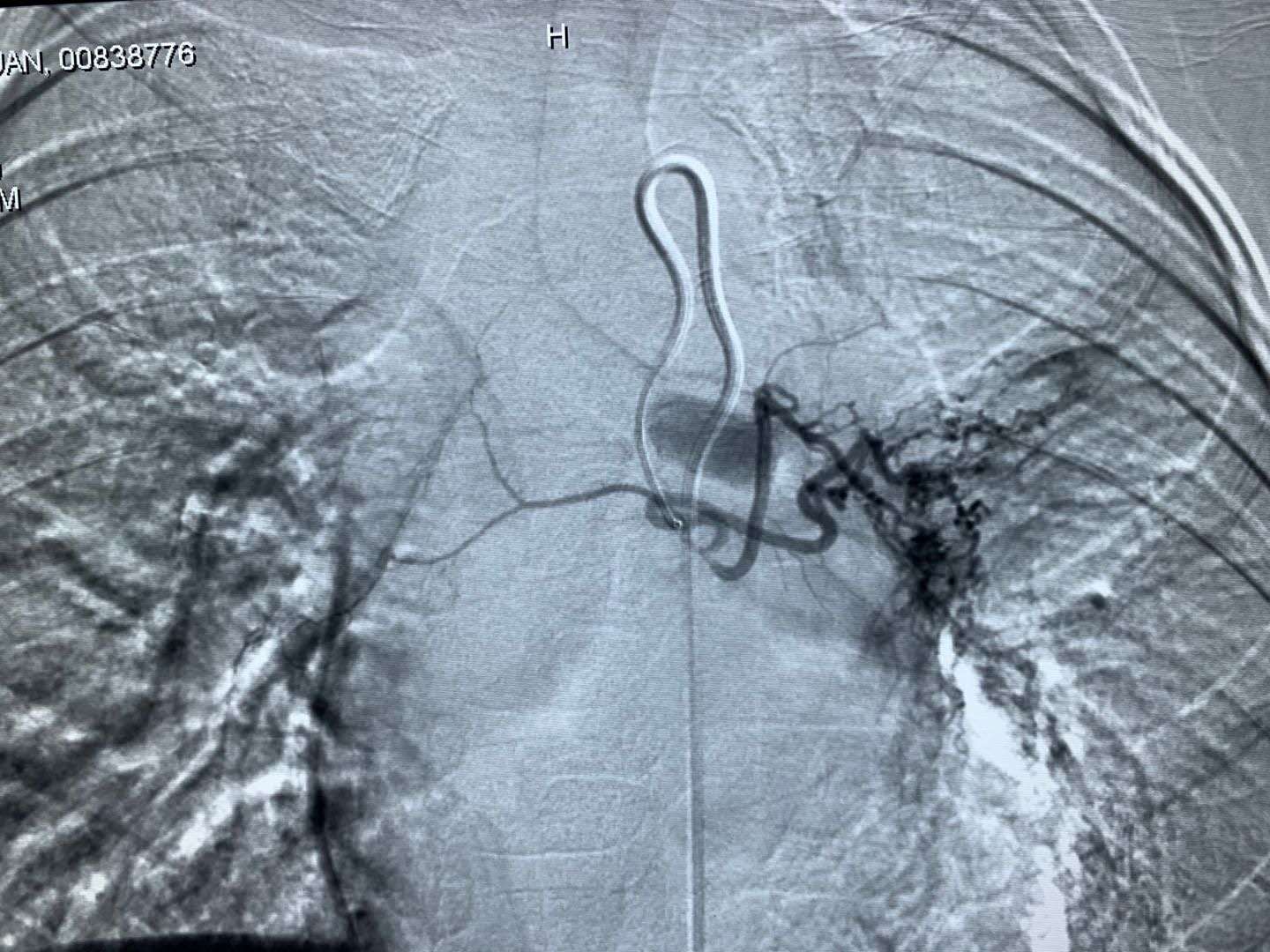 科室立即请介入血管外科、心胸外科及成人呼吸科会诊,并经家属同意后,为小涵制定了肿物处血管栓塞再经支气管镜切除并活检的诊疗方案,但是孩子年龄小,找到供应肿物的血管不容易,栓塞成功更是困难。介入血管外科经过努力,成功为小涵施行了支气管动脉造影+栓塞术,开启了孩子康复的希望之门,术后,儿童呼吸介入团队在支气管镜下为小涵切除肿物,术中预先留置球囊预防急性出血,手术取得成功,孩子左下叶通气功能迅速恢复。术后病检结果显示,为透明细胞糖瘤,属于儿童罕见的良性肿瘤。又通过第4次支气管镜,将左肺上叶残留肿物清除,小涵左肺上叶得以成功保住,康复出院。