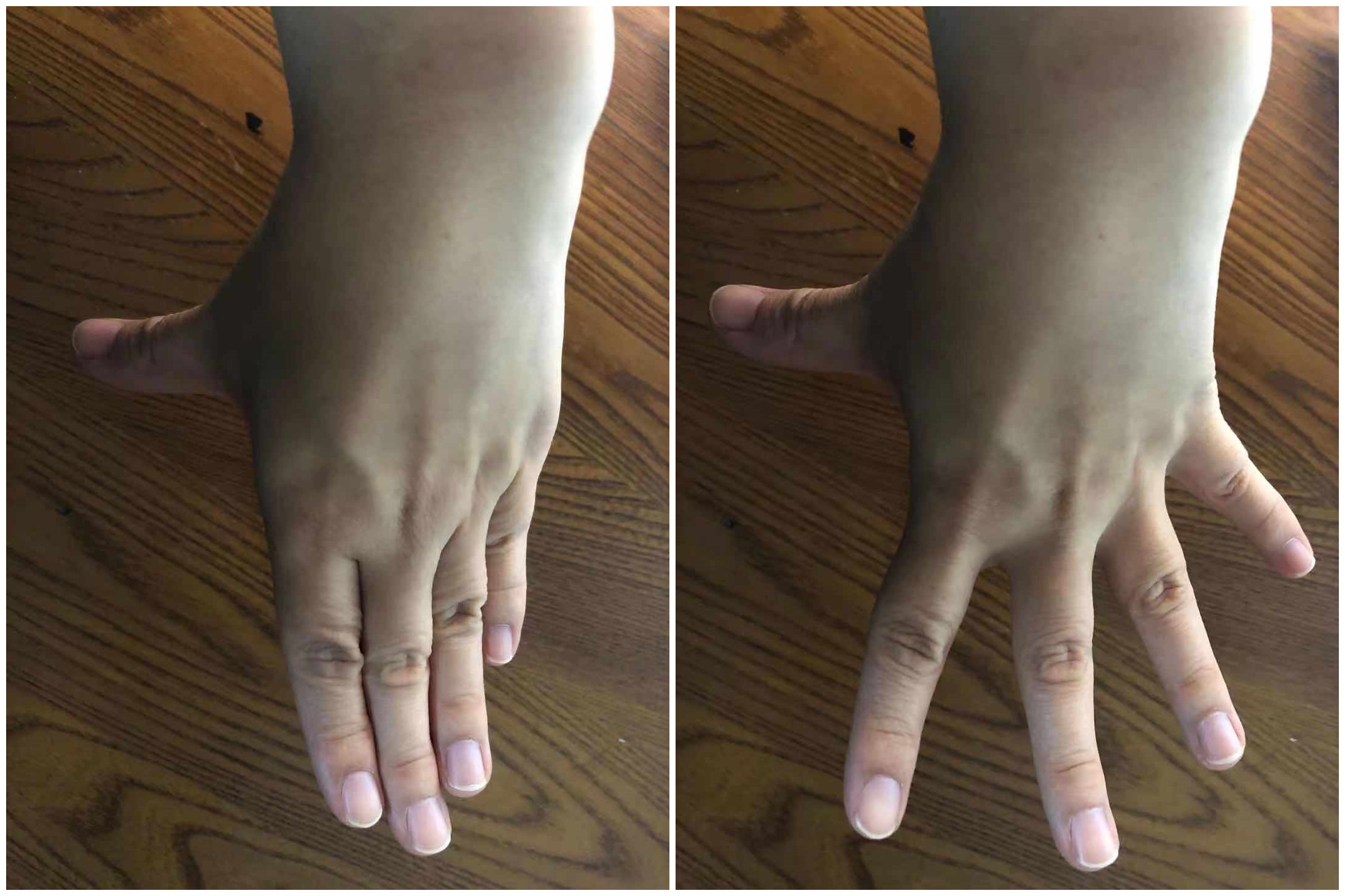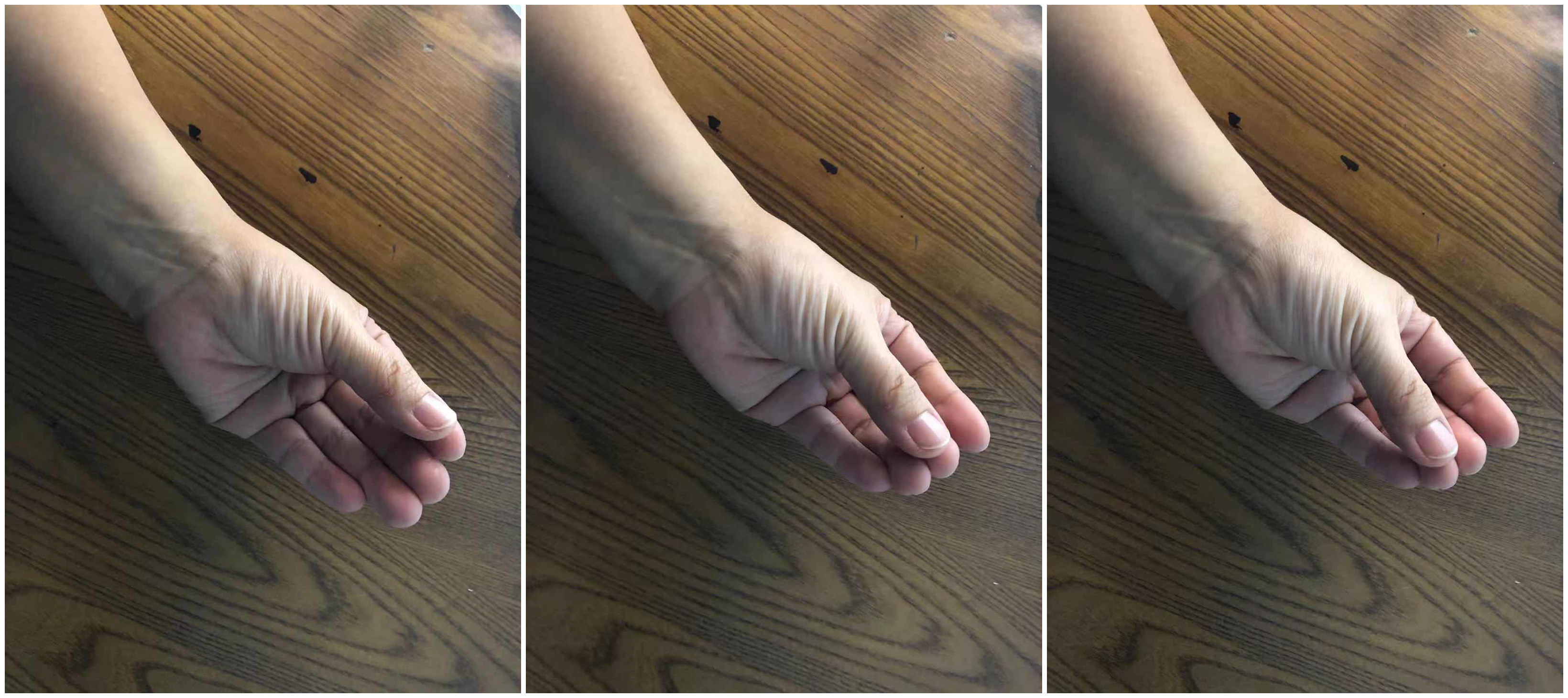 2.屈掌运动:拇指远离食指,其余四指并拢,弯曲手掌(拇指不动),持续片刻,还原。重复10次。