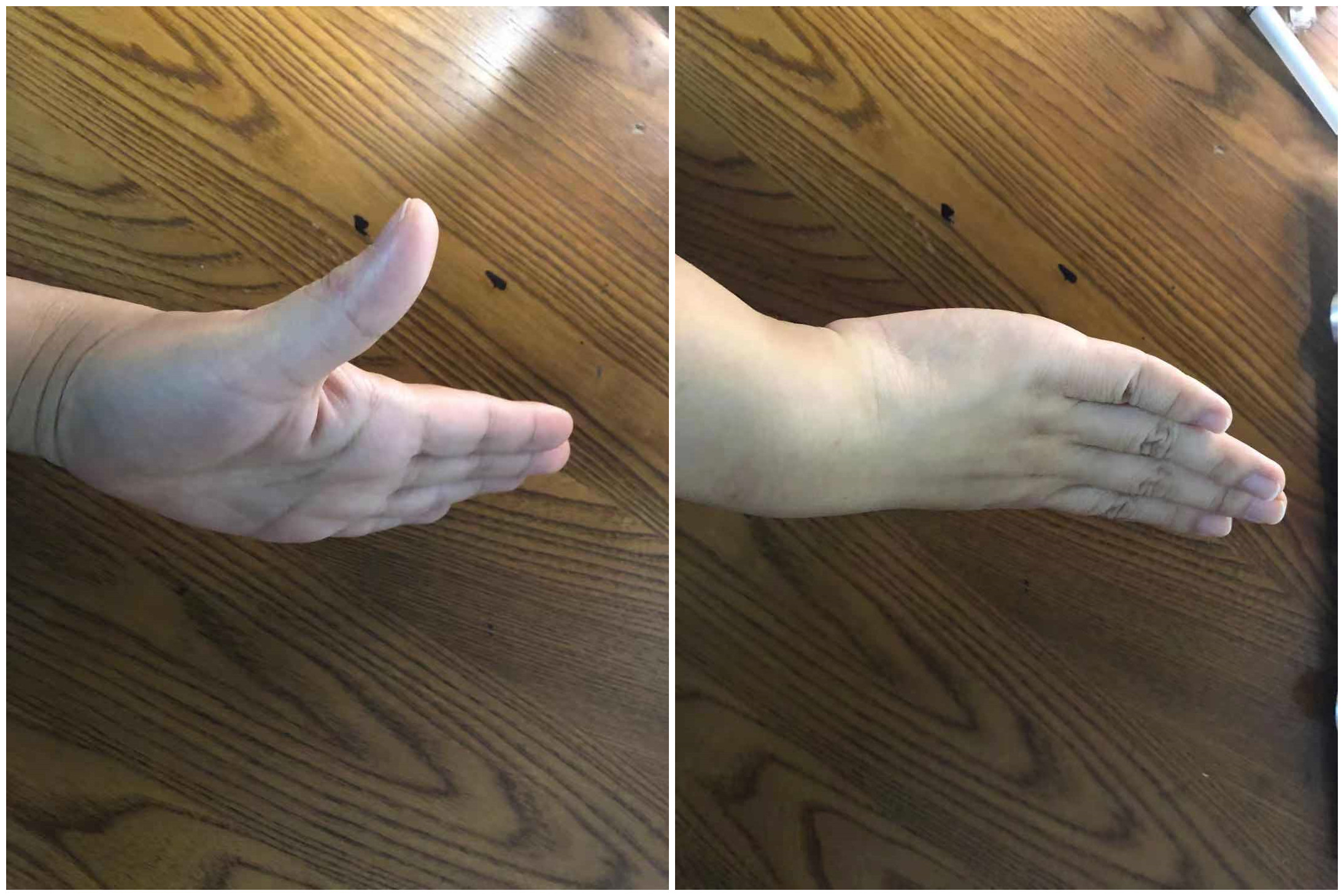 1.外展运动:五指伸直,拇指尽量远离食指,持续片刻,还原。重复10次。