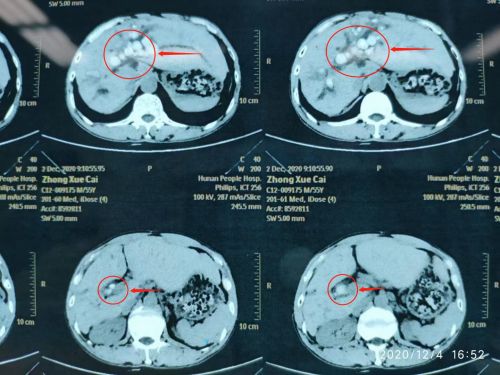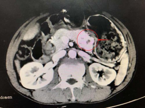 ct上可以清楚地看到胰腺肿瘤(红圈内)。