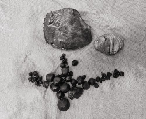 术中切除的部分肝脏、胰腺肿瘤和肝内外胆管结石。