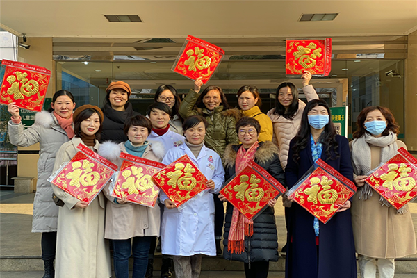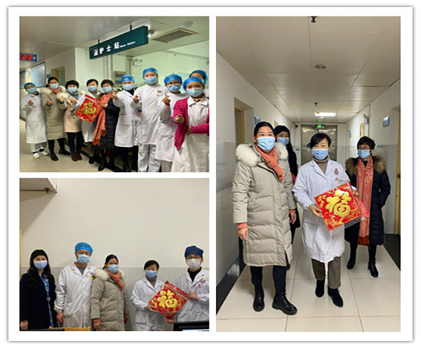 步入外科大楼,吴书记等一行人带头执行新冠期间防控要求,戴好口罩,配合各楼层护理人员的体温检测和健康询问。慰问组一行人走到护士站,首先向值班的医务人员送上新春“福”字,寓意迎春接福,表达分工会、党总支对职工的关心关爱,并向大家送上节日慰问品,表示慰问。