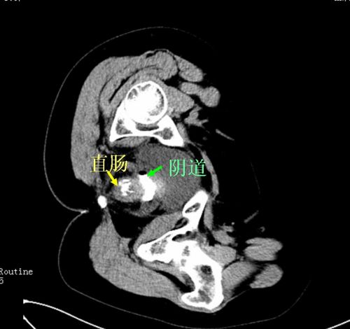 直肠阴道内均有造影剂,提示直肠阴道瘘。